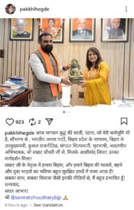 गौरतलब है कि पाखी हेगड़े ने इंस्टाग्राम पर बिहार के उपमुख्यमंत्री सम्राट चौधरी के साथ तस्वीर पोस्ट करके कैप्शन में लिखा है कि ‘आज भगवान बुद्ध की धरती, पटना, जो मेरी कर्मभूमि भी है, सौभाग्य से भारतीय जनता पार्टी, बिहार प्रदेश के चाणक्य, बिहार के उपमुख्यमंत्री, कुशल राजनीतिज्ञ, संगठन शिल्पकारी, मृदभाषी, आदरणीय अभिभावक, श्री सम्राट चौधरी जी से मिलकर आशीर्वाद लिया! उनका मार्गदर्शन मिला !’