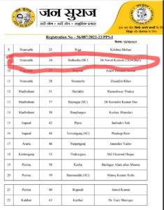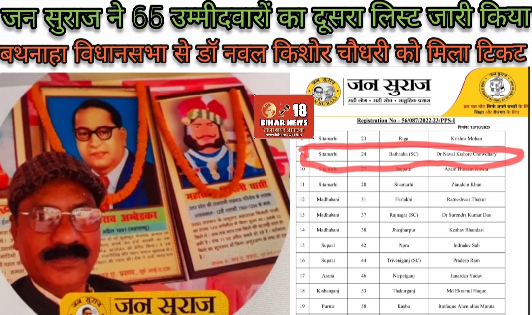 *जन सुराज ने 65 उम्मीदवारों का दूसरा लिस्ट जारी किया, बथनाहा(सीतामढ़ी) से डॉ. नवल किशोर चौधरी को मिला जन सुराज से टिकट*