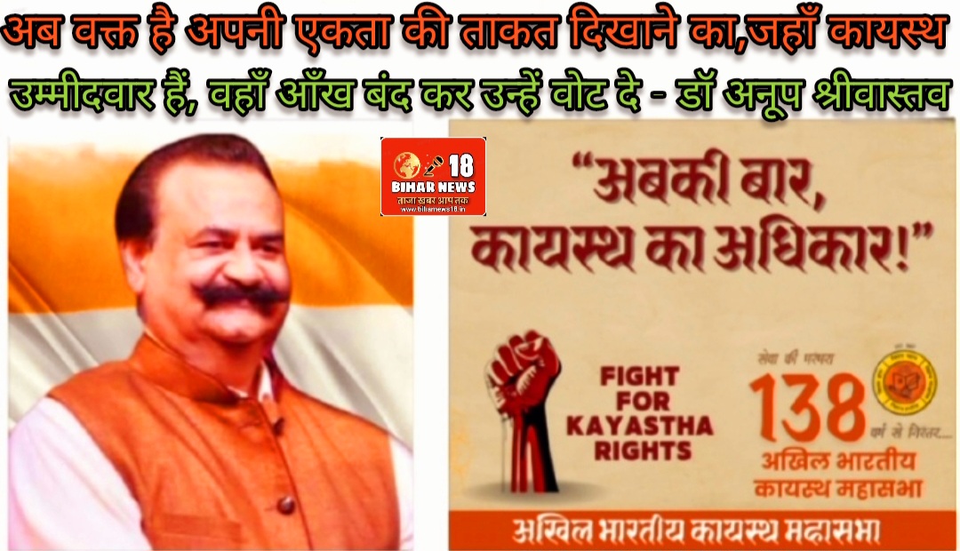 ** रविंद्र कुमार,संपादक/पटना, 30 अक्टूबर 2025** :: बिहार विधानसभा चुनाव 2025 से पहले अखिल भारतीय कायस्थ महासभा ने कायस्थ समाज को संगठित होकर अपनी राजनीतिक ताकत दिखाने का आह्वान किया है। महासभा के प्रमुख डॉ. अनूप श्रीवास्तव ने एक बयान जारी कर कहा कि अब समय आ गया है जागने का, एकजुट होने का और अपनी एकता की ताकत साबित करने का। उन्होंने स्पष्ट शब्दों में अपील की, “जहां कायस्थ उम्मीदवार खड़े हैं, वहां आंख बंद करके उन्हें वोट दो। इस बार वोट नहीं, अपनी पहचान दो!” यह बयान कायस्थ समाज की लंबे समय से चली आ रही राजनीतिक उपेक्षा के खिलाफ एक मजबूत आवाज के रूप में सामने आया है।