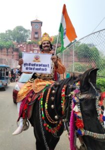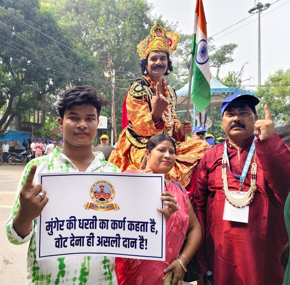 राजन ने कर्ण की वेशभूषा—धनुष, कवच, सोने का मुकुट—धारी लोगों को संदेश दिया: “कर्ण ने सोना दान किया था, तुम वोट दान करो। लोकतंत्र को महान बनाओ। मुंगेर की धरती का कर्ण कहता है—वोट देना ही असली दान है।” मुंगेर मंच द्वारा आयोजित इस कार्यक्रम में शपथ दिलाई गई, जिसमें स्वतंत्र, निष्पक्ष वोटिंग का वादा किया गया।