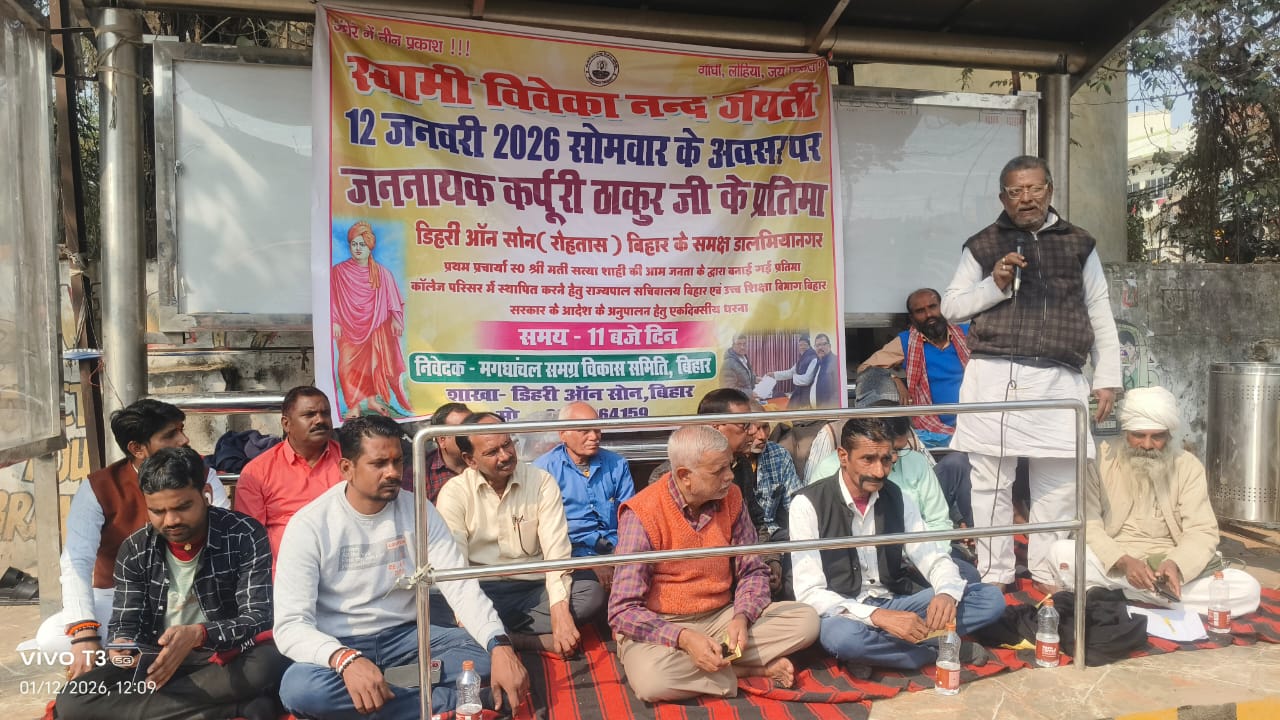 रविन्द्र कुमार, संपादक /डेहरी-ऑन-सोन (रोहतास)/ 12 जनवरी 2026 :: स्वामी विवेकानंद जयंती के पावन अवसर पर आज स्थानीय जननायक कर्पूरी ठाकुर प्रतिमा स्थल पर वीर कुंवर सिंह विश्वविद्यालय (आरा) की कार्यप्रणाली और प्रशासनिक उदासीनता के विरुद्ध एकदिवसीय धरना संपन्न हुआ। सामाजिक संस्था ‘मगधाचल समग्र विकास समिति’ (शाखा रोहतास) के बैनर तले आयोजित इस धरने में विश्वविद्यालय प्रशासन पर सरकार, राजभवन और न्यायालय के आदेशों की अवहेलना करने का गंभीर आरोप लगाया गया।