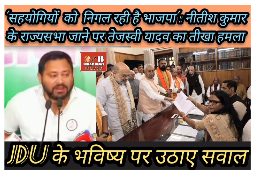 रविंद्र कुमार संपादक /पटना /05 मार्च 2026 :: बिहार के मुख्यमंत्री नीतीश कुमार के राज्यसभा नामांकन पर विपक्षी खेमे से तीखी प्रतिक्रिया आई है। नेता प्रतिपक्ष तेजस्वी यादव ने भाजपा पर गंभीर आरोप लगाते हुए कहा कि भाजपा अपने सहयोगियों को ‘खत्म’ करने की राजनीति करती है। उन्होंने जदयू की तुलना शिवसेना और अकाली दल जैसे दलों से करते हुए दावा किया कि अब नीतीश कुमार की पार्टी का अस्तित्व भी खतरे में है।