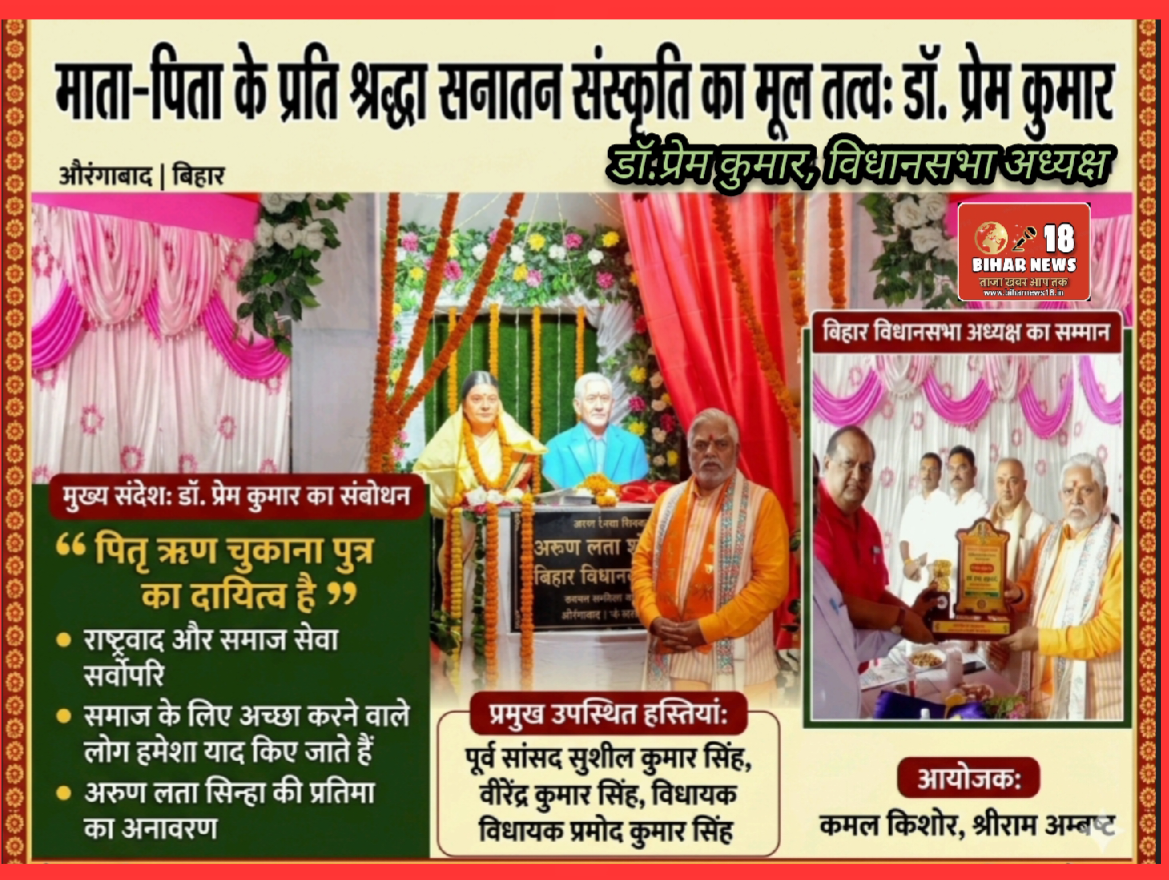 रविंद्र कुमार,संपादक/औरंगाबाद /13 अप्रैल 2026 :: बिहार विधानसभा के अध्यक्ष डॉ. प्रेम कुमार ने कहा है कि माता-पिता के प्रति अटूट श्रद्धा ही भारतीय सनातन संस्कृति का मूल आधार है। उन्होंने जोर देकर कहा कि पितृ ऋण से मुक्ति पाना हर पुत्र का नैतिक और सांस्कृतिक दायित्व है। डॉ. कुमार औरंगाबाद के बारून में प्रख्यात समाजसेविका और शिक्षाविदुषी अरुणलता सिन्हा की प्रतिमा अनावरण समारोह को मुख्य अतिथि के रूप में संबोधित कर रहे थे।