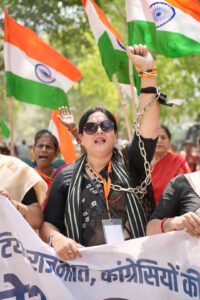 *प्रतीकात्मक विरोध*: लोहे की जंजीरों में जकड़ी महिला कार्यकर्ता बनीं आकर्षण का केंद्र; विपक्ष की “मानसिकता” पर साधा निशाना।
