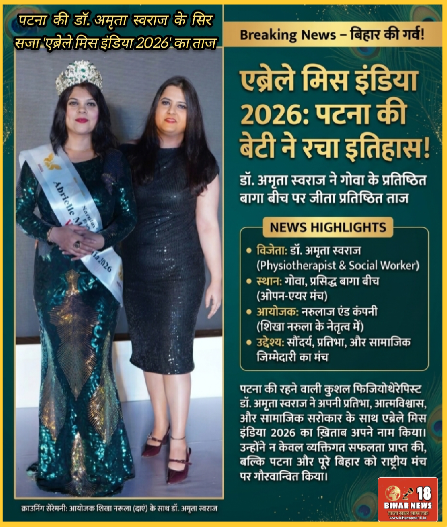 रविंद्र कुमार,संपादक /पणजी/पटना/27 अप्रैल 2026 :: बिहार की राजधानी पटना की बेटी डॉ. अमृता स्वराज ने गोवा के प्रतिष्ठित बागा बीच पर आयोजित ‘एब्रेले मिस इंडिया 2026 (सीजन 6)’ का खिताब जीतकर प्रदेश का नाम देशभर में रोशन किया है। यह भव्य आयोजन न केवल ग्लैमर बल्कि प्रतिभा और सामाजिक जिम्मेदारी का एक अनूठा संगम बनकर उभरा।