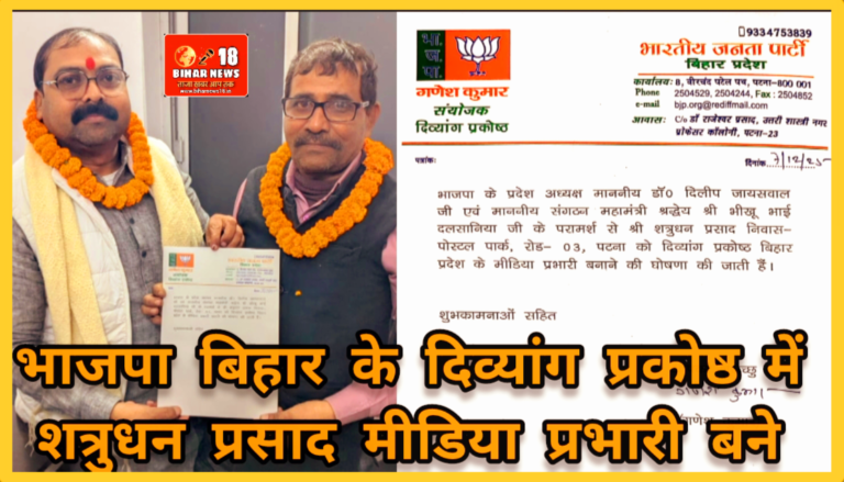 *शत्रुधन प्रसाद को दिव्यांग प्रकोष्ठ बिहार प्रदेश का नया मीडिया प्रभारी नियुक्त किया गया*...